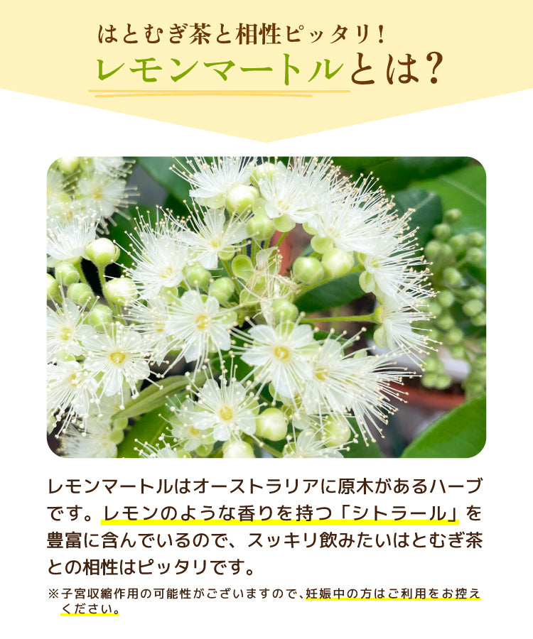 ✅【スッキリした飲み心地】美へと導くはとむぎ茶に、レモンの爽やかな香りが楽しめる新感覚な有機レモンマートルはとむぎ茶に仕上げました。